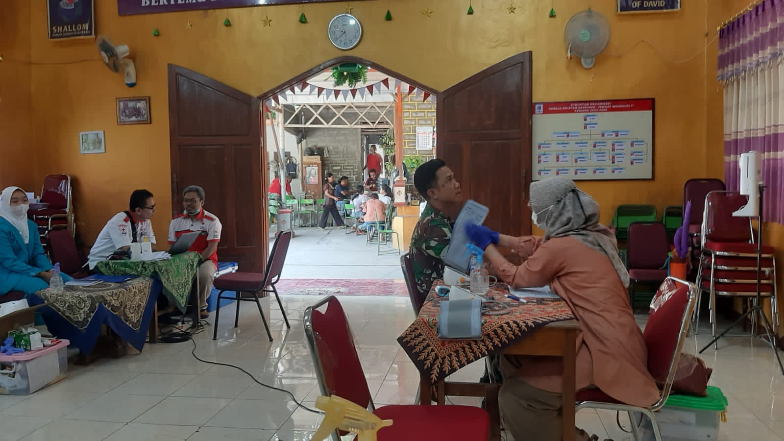 WONOGIRI – Anggota Babinsa Koramil 10/Wuryantoro, Serda Dwiyanto dan Koptu Ariyanto, melaksanakan bakti sosial dengan turut menyumbangkan darahnya bersama-sama dengan jemaat Gereja Kristen Bersinar, Dusun Gunung Cilik RT 01/04 Desa Mlopoharjo, Kecamatan Wuryantoro, Kabupaten Wonogiri, pada Minggu (22/10/2023).