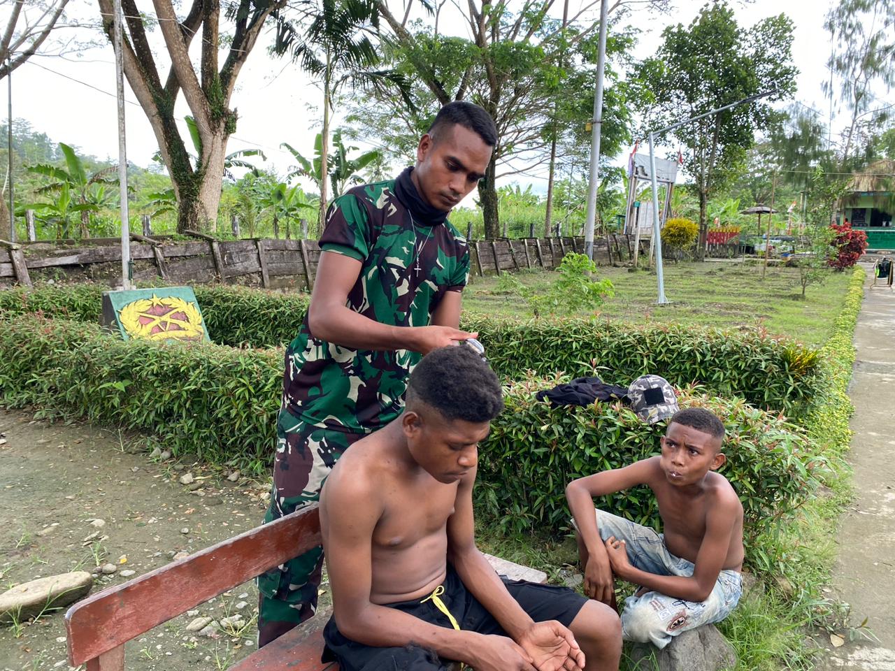 KEEROM – Wujud kepedulian Satgas Pamtas Statis RI-PNG Yonif 122/Tombak Sakti Pos Waris, membantu anak-anak Papua berpenampilan rapi dengan memangkas rambut anak-anak Papua di Kampung Banda Distrik Waris Kabupaten Keerom, Provinsi Papua, pada Minggu (30/7/2023).