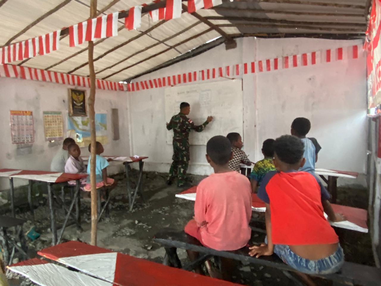 PAPUA – Untuk membantu pemerintah dalam menciptakan generasi penerus bangsa yang berkualitas dan mampu bersaing di era globaliasi, Satgas Yonif RK 115/ML Pos Pruleme membuka kelas belajar bagi siswa kelas SD yang dilaksanakan di “Sanggar Belajar” yang berlokasi di Pos Pruleme, Distrik Mulia, Kabupaten Puncak Jaya seperti nampak pada hari Kamis (24/8/2023).