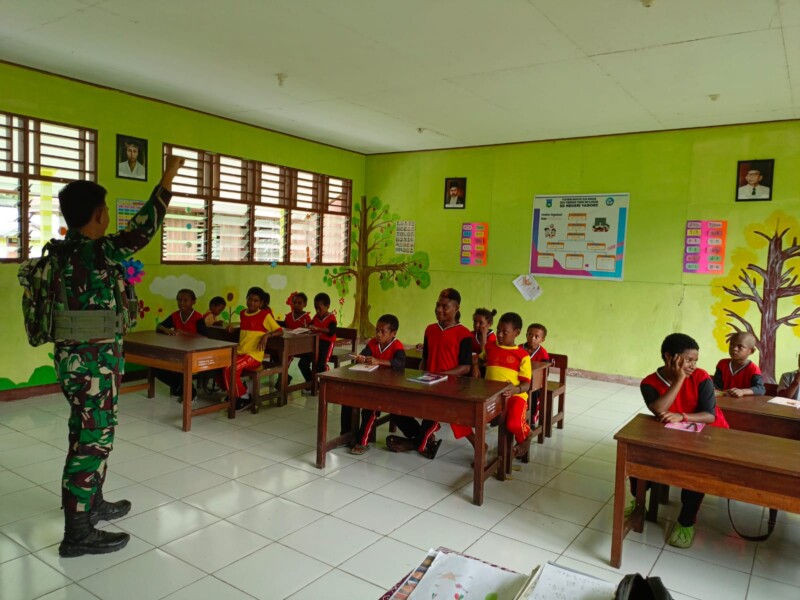 Teluk Wondama, – Pos Naikere Satgas Pamtas RI-PNG Kewilayan Papua Barat Yonif 642/kps membantu memberikan ilmu pengetahuan dan membagikan sargal berupa alat tulis di SDN Yabore, Kabupaten Teluk Wondama, Provinsi Papua Barat, pada Sabtu (12/10/2024).