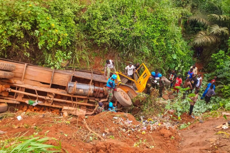 Konga, – Satgas Kizi TNI Konga XXXVII-J MINUSCA membantu evakuasi truk yang terguling ke dalam jurang sedalam 8 meter yang berlokasi di Jalan Pasar Besar sektor TOB Berberati, pada Minggu (23/6/2024).