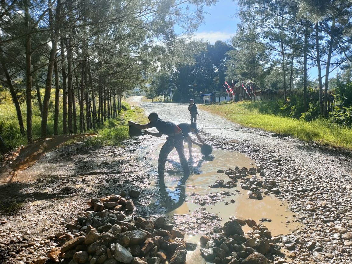 “Kegiatan ini bertujuan untuk menimbulkan rasa gotong royong antara TNI dengan warga dalam memperbaiki jalan yang rusak, walaupun sifatnya sementara, tetapi warga tetap bisa mendapatkan akses jalan yang lebih baik,” ungkap Danpos.