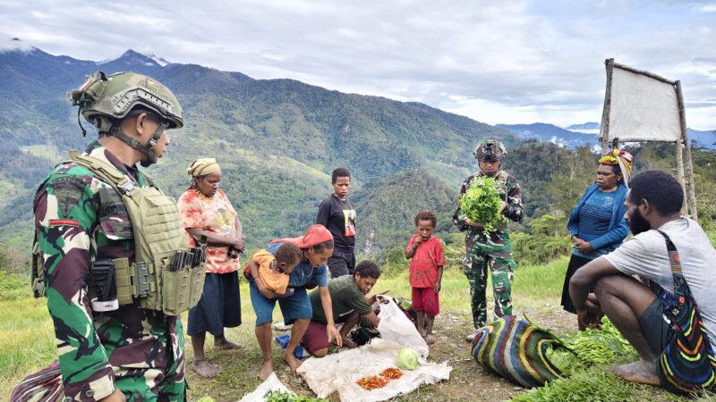 Pintu Jawa, Papua – Di sebuah pagi yang sejuk di Kampung Pintu Jawa, aroma tanah basah dan sayuran segar memenuhi udara. Di bawah tenda sederhana, deretan kol, cabai merah, dan daun ubi tertata rapi di atas tikar. Mama-mama Papua duduk bersila, menanti pembeli seperti biasa. Namun hari itu berbeda, karena yang datang adalah prajurit-prajurit TNI dari Satgas Yonif 700/Wira Yudha Cakti.