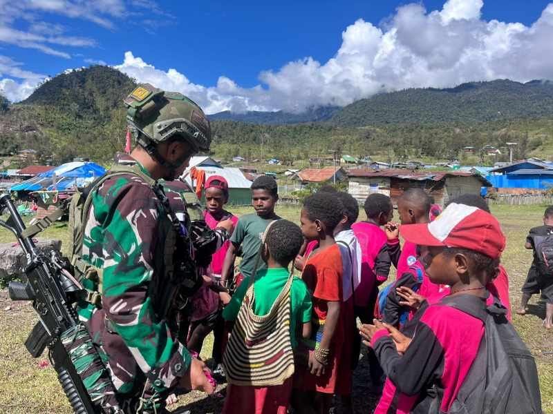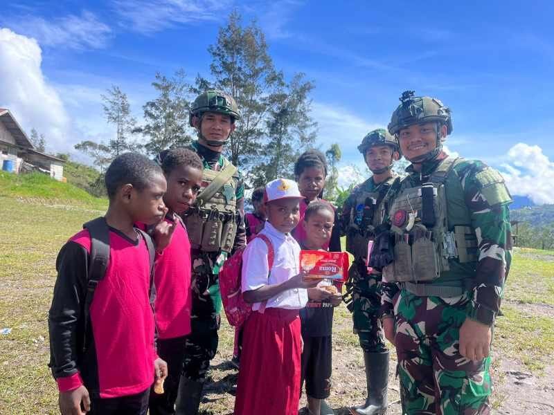 Sinak, Papua – Di tengah sunyi pegunungan Papua yang menjulang dan heningnya udara pagi di SD Inpres Sinak, tiba-tiba pecah tawa riang anak-anak yang menyambut tamu tak biasa. Mereka bukan artis atau pejabat. Mereka adalah para prajurit TNI, berseragam loreng, bersenyum hangat, yang datang bukan untuk patroli, tapi untuk bermain, menemani, dan menyayangi.