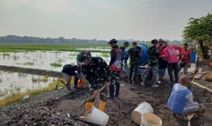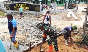 Sejumlah unsur ikut bergotong royong bersama Babinsa, Kepala Desa Pagar Merbau III, Budi Cahyadi dan unsur aparatur Desa juga masyarakat.