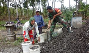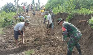 Sejumlah unsur ikut bergotong royong bersama Babinsa, Kepala Desa Pagar Merbau III, Budi Cahyadi dan unsur aparatur Desa juga masyarakat.