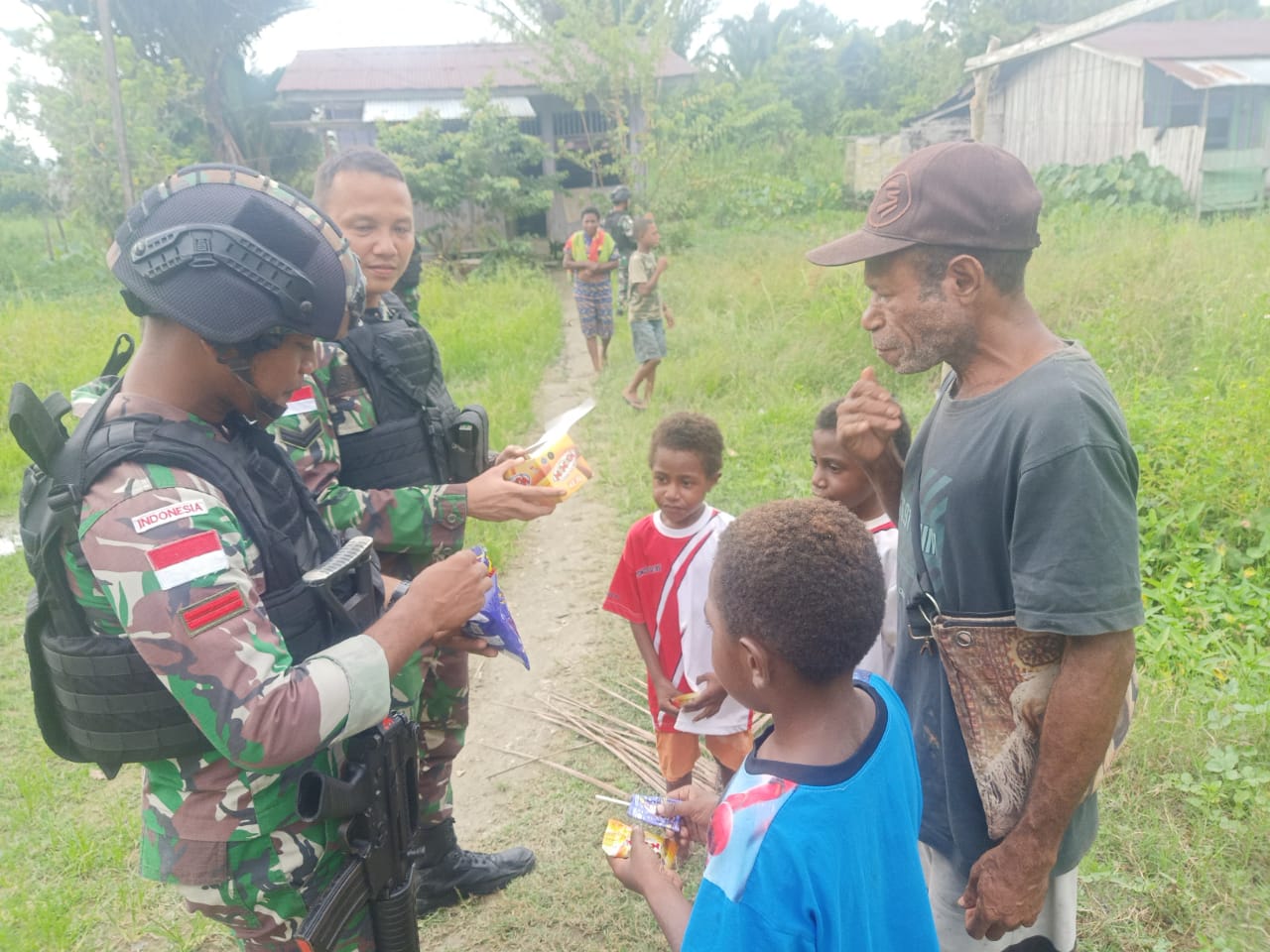 Di sela-sela kegiatan anjangsana, personel Pos Bendungan Tami juga memberikan Permen kepada anak anak Masyarakat Kampunv Swakrsa dan Kampung Tanah Merah agar anak-anak selalu nyaman dengan keberadaan Satgas Pamtas Yonif 132/BS khususnya Pos Bendungan Tami.