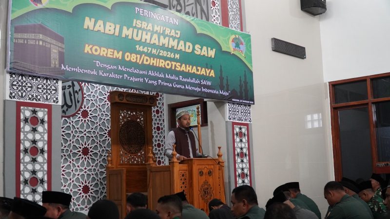 Madiun, – Korem 081/DSJ menggelar peringatan Isra Mikraj Nabi Muhammad SAW 1447 H di Masjid Jenderal Sudirman Makorem 081/DSJ, Jl. Pahlawan No. 50, Kota Madiun, Kamis (22/1/2026). Kegiatan ini berlangsung khidmat dan diikuti oleh prajurit serta ASN satuan tersebut.