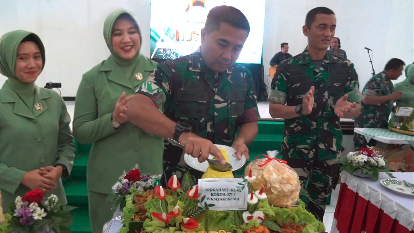 Untuk diketahui, Tasyakuran HUT Ke-62 Korem 071/Wijayakusuma ditandai dengan pemotongan tumpeng oleh Danrem 071/Wijayakusuma Kolonel Czi Mohammad Andhy Kusuma, S.Sos., M.M., M.Han didampingi Ketua Persit Kartika Chandra Kirana Koorcab Rem 071 PD IV/Diponegoro Ny. Diah Mohammad Andhy Kusuma. Potongan tumpeng tersebut selanjutnya diberikan kepada Pelda Priyono sebagai perwakilan prajurit dan PNS tertua PNS Kholid.