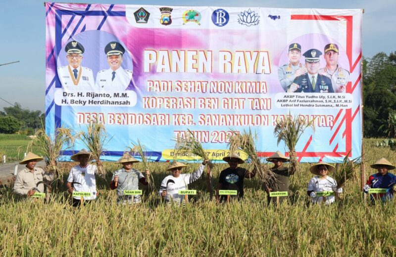 Blitar, – Di bawah terik matahari dan di tengah hamparan sawah yang menguning sempurna, semangat baru pertanian Blitar berdenyut kencang. Minggu (27/4/2025), Forkopimda Kabupaten Blitar bersatu bersama rakyat dalam Panen Raya dan Sosialisasi Padi Sehat Tanpa Kimia di Dusun Bendosari, Kecamatan Sanankulon. Sebuah langkah nyata untuk memperkuat ketahanan pangan sekaligus menjaga kelestarian bumi.