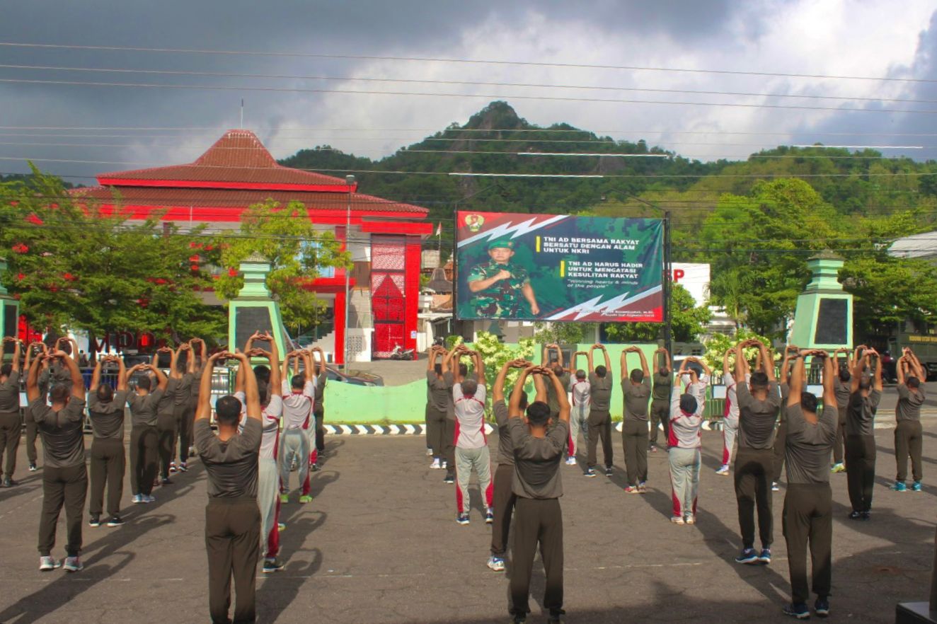 WONOGIRI – Memperkuat tali silaturahmi dengan anggota dan menjaga kesehatan serta kebugaran tubuh, Dandim 0728/Wonogiri Letkol Inf Edi Ristriyono memimpin apel pagi yang dilanjutkan dengan olahraga bersama di Halaman Makodim, pada Jumat (12/1/2024).