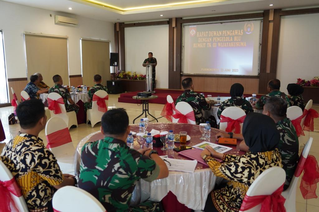 PURWOKERTO – Danrem 071/Wijayakusuma Kolonel Czi Mohammad Andhy Kusuma, S.Sos., M.M., M.Han., memimpin rapat koordinasi Badan Pengawas dengan pengelola Badan Layanan Umum (BLU) Rumkit TK-III 04.06.01 Wijayakusuma Purwokerto, Jumat (23/6/2023).