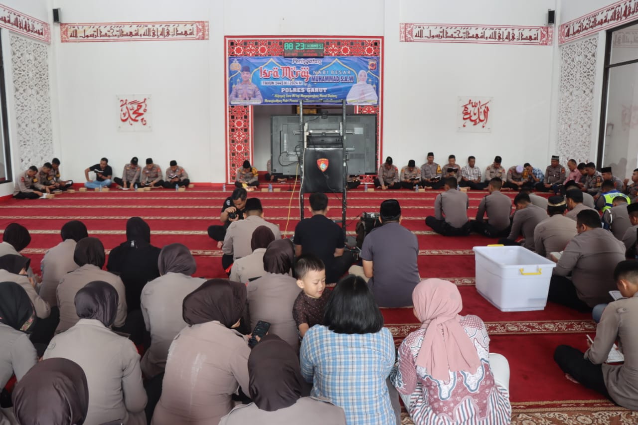 GARUT – Polres Garut menggelar kegiatan pengajian dalam rangka memperingati Isra Mi’raj 1445 H / 2024 di Masjid Nurul Hakim, Polres Garut, pada Kamis (8/2/2024).