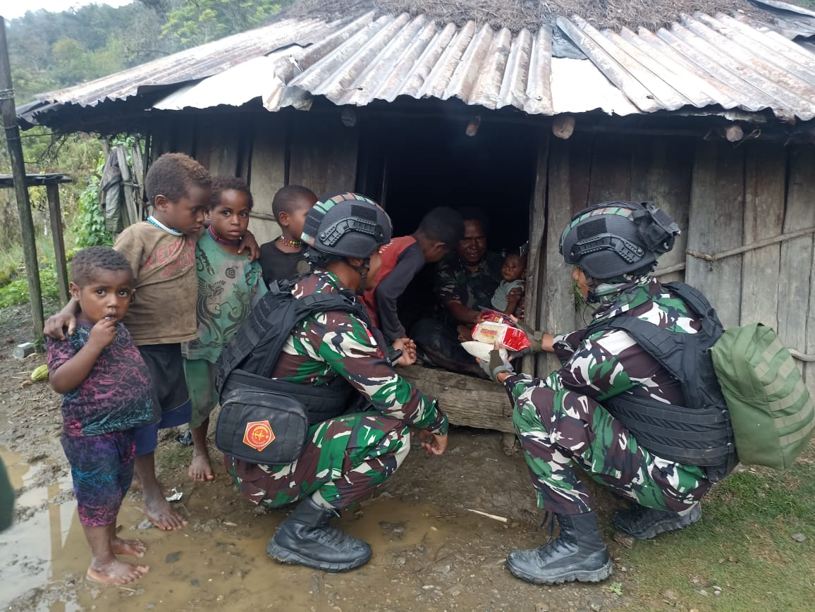 PAPUA – Satgas Yonif RK 115/ML Pos Tirineri melaksanakan pengobatan door to door dan membagikan sembako kepada masyarakat di Kampung Tirineri, Distrik Yambi, Kabupaten Puncak Jaya, Senin (11/9/2023).