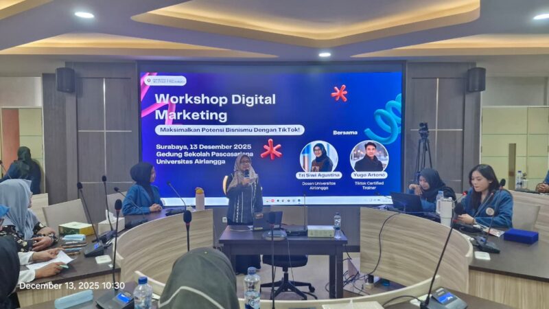 Menyadari realitas tersebut, mahasiswa Program Studi Pengembangan Sumber Daya Manusia (PSDM) Sekolah Pascasarjana Universitas Airlangga (UNAIR) menggelar seminar bertajuk “Maksimalkan Potensi Bisnismu dengan TikTok” bagi emak-emak yang tergabung dalam Paguyuban UMKM Manggarsari. Kegiatan berlangsung di Ruang Kuliah Internasional Marwadewa 3, Gedung Sekolah Pascasarjana UNAIR, Surabaya, Sabtu (13/12/2025).