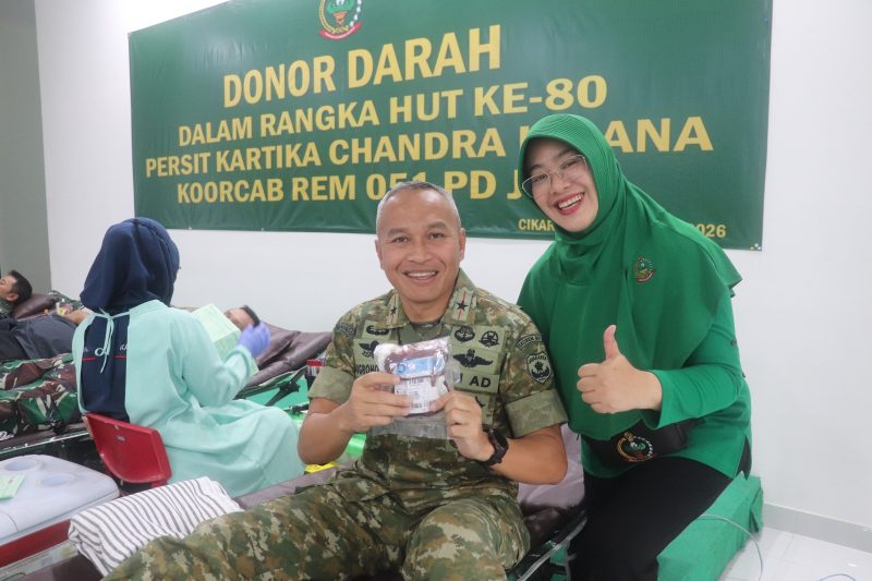 Cikarang, Jawa Barat – Peringatan Hari Ulang Tahun (HUT) ke-80 Persit Kartika Chandra Kirana (KCK) dimaknai dengan aksi kemanusiaan. Persit KCK Koorcab Rem 051 PD Jaya menggelar kegiatan donor darah di Aula Makorem 051/Wijayakarta, Cikarang, Kabupaten Bekasi, Kamis (5/2/2026).