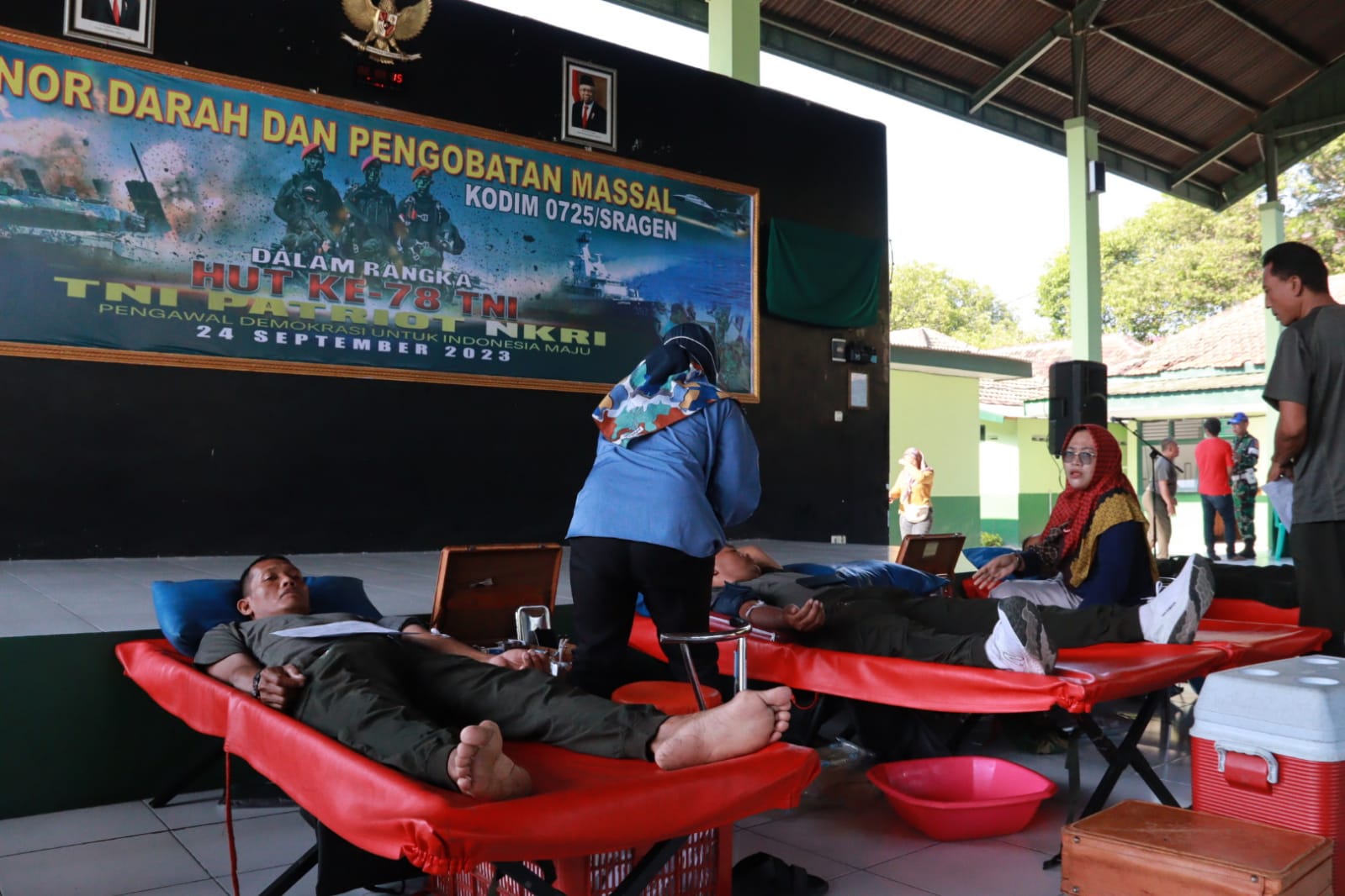Ratusan peserta donor, pengobatan gratis dan penerima sembako dari pagi sudah memenuhi aula guyub rukun Makodim Sragen. Peserta donor darah berasal dari anggota TNI, PNS dan KBT (Keluarga Besar TNI) Kodim Sragen, Minvet dan Yonif 408. Peserta pengobatan masal dari masyarakat umum yang telah disosialisasikan sebelumnya oleh Babinsa. Pihak Kodim menyiapkan 150 paket sembako berupa beras, gula, minyak dan mie instan bagi masyarakat peserta pengobatan gratis.