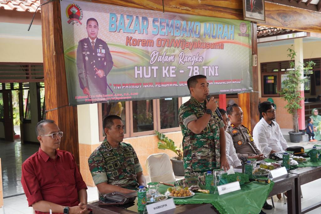 Pada kesempatan yang sama, Danrem menyampaikan dalam rangka memperingati HUT Ke-78 TNI, Korem 071/Wijayakusuma akan melaksanakan beberapa kegiatan yang salah satunya bazar sembako murah ini, dimana filosofi atau tujuan daripada kegiatan itu adalah untuk membuat ikatan antara TNI dengan Rakyat semakin kuat.