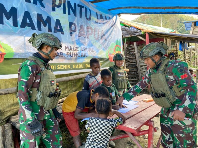 Puncak, – Prajurit TNI dari Satuan Tugas Batalyon Infanteri (Satgas Yonif) 700/Wyc membantu kegiatan belajar mengajar di depan Pos Pintu Jawa Distrik Mage’Abume Kab. Puncak, Papua, Selasa (18/3/2025).