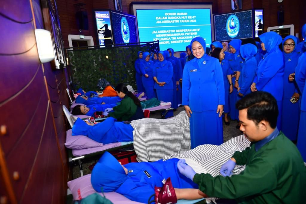 JAKARTA – Dalam rangka menyambut Hari Ulang Tahun (HUT) ke-77 Jalasenastri Tahun 2023, TNI Angkatan Laut menggelar kegiatan Donor Darah yang dihadiri langsung oleh Ketua Umum Jalasenastri Ny. Fera Muhammad Ali bertempat di Auditorium Denma Mabesal, Cilangkap, Jakarta Utara, Senin (7/8/2023).