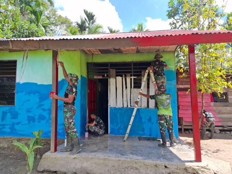 Seperti halnya pos Kalibom lakukan yang di pimpin Serda Ilham beserta 10 anggota dalam menyambut hari Kemerdekaan serta sebagai wujud nyata kepedulian untuk membantu masyarakat perbatasan dalam kegiatan merestorasi rumah milik Mama Berneta Mosoi Tawa serta membagikan bendera kepada warga.