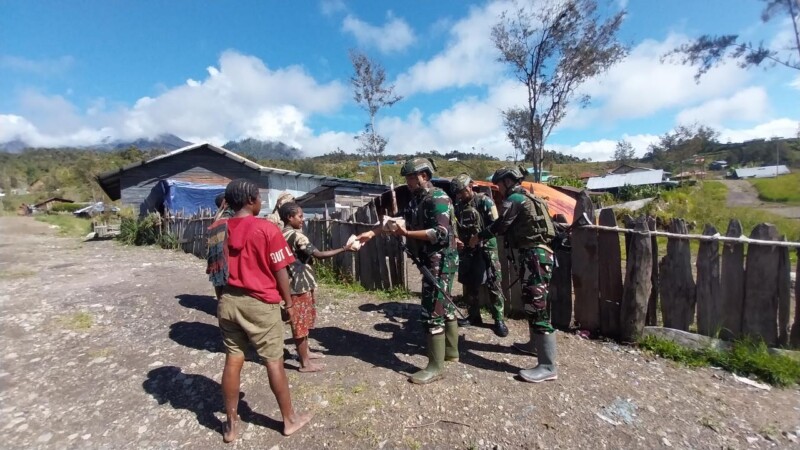 Puncak, – Prajurit Satgas Pamtas RI-PNG Mobile Yonif 323/BP Kostrad Pos Sinak Bandara, melaksanakan kegiatan Minggu Kasih dengan membagikan nasi bungkus kepada masyarakat yang lewat depan Pos, Distrik Sinak, Kabupaten Puncak, Provinsi Papua, pada Minggu (30/6/2024).