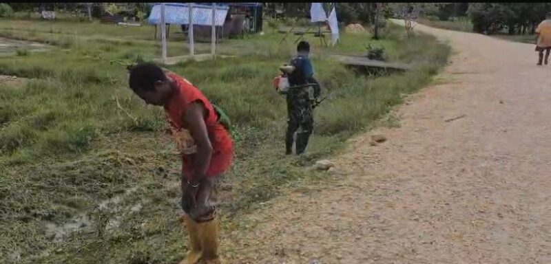 Papua Barat Daya, – Personel Satgas Pengamanan Perbatasan (Pamtas) RI-PNG Yonif 763/Sanobar Abhirama (SBA) Pos Suswa bersama warga Kampung Suswa, Distrik Mare, Papua Barat Daya, menggelar kegiatan gotong royong membersihkan lingkungan, Sabtu (10/1/2025).