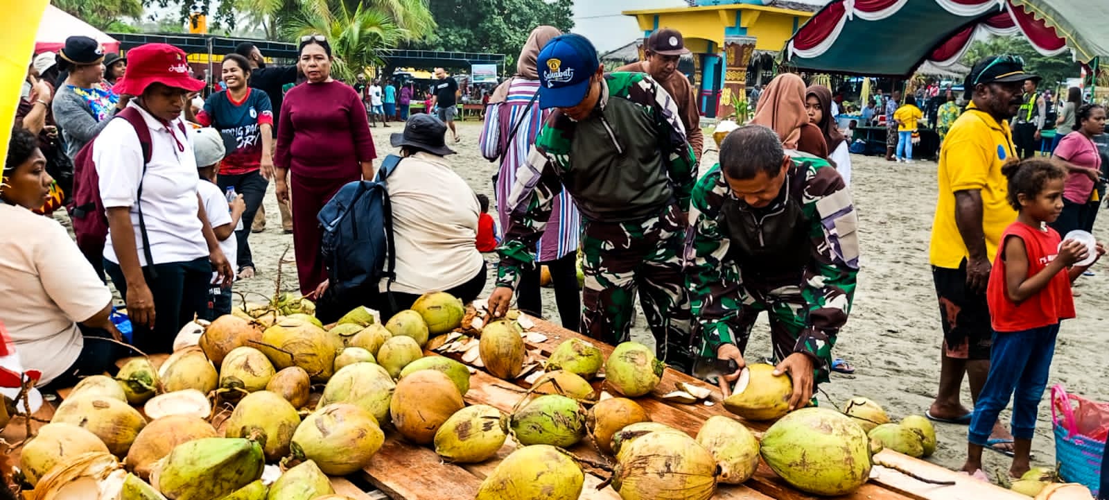 SKOUW YAMBE –Satuan Tugas Pengamanan Perbatasan RI-PNG Sektor Utara Yonif 122/TS, yang berada dibawah naungan Korem 172/PWY Pos Kout ikut serta mensukseskan kegiatan Festival Kelapa ke-2 yang kembali digelar di Kampung Skouw Yambe, Distrik Muara Tami, Minggu (10/9/2023).