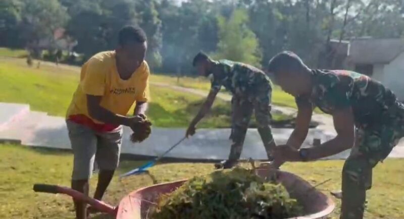 Kerja bakti ini menjadi bagian dari pembinaan teritorial Satgas sekaligus wujud nyata kepedulian terhadap lingkungan tempat mereka bertugas. Sejak pagi, prajurit dan masyarakat terlihat memungut sampah, memangkas rumput liar, hingga menata halaman gereja agar kembali rapi dan nyaman digunakan warga untuk beribadah.
