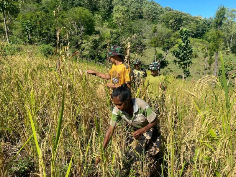 TTU, – Personel Satgas Pamtas RI–RDTL Sektor Barat dari Yonarhanud 15/DBY ikut terlibat dalam kegiatan panen bersama warga di Desa Naekake B, Kecamatan Mutis, Kabupaten Timor Tengah Utara (TTU), Senin (23/4/2023). Kegiatan ini menjadi bagian dari upaya mendukung ketahanan pangan dan meningkatkan perekonomian masyarakat di wilayah perbatasan.