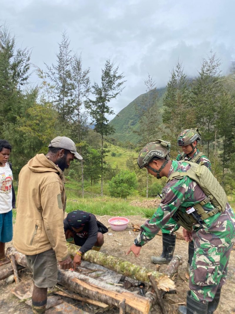 Kegiatan yang berlangsung hangat dan penuh kekeluargaan ini menyasar rumah-rumah warga secara langsung, salah satunya honai milik Bapak Tius, tokoh masyarakat setempat yang telah lama hidup berdampingan dengan alam dan adat istiadat lokal. Kehadiran prajurit TNI disambut dengan senyum dan pelukan tulus, memperlihatkan eratnya hubungan antara Satgas dan warga.