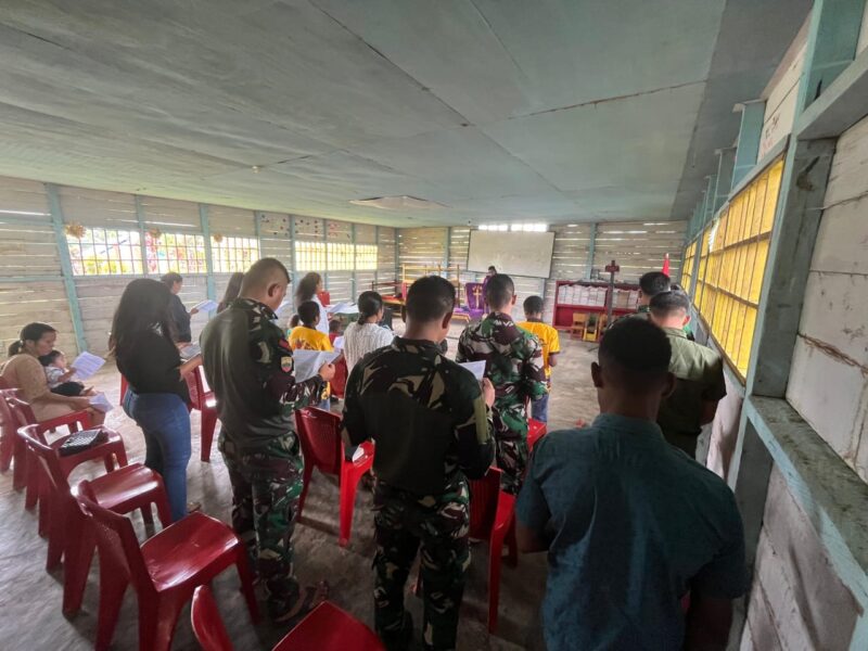 Mappi, Papua Selatan – Personel Pos Venaha Satgas Yonif 123/Rajawali melaksanakan kegiatan ibadah bersama umat Kristiani di Gereja Katolik dan Rumah Ibadah Kampung Venaha, Distrik Venaha, Kabupaten Mappi, Papua Selatan, pada Minggu (7/12/2025). Kegiatan ini menjadi bagian dari upaya satgas dalam mempererat hubungan dengan masyarakat sekaligus meningkatkan keimanan para prajurit.
