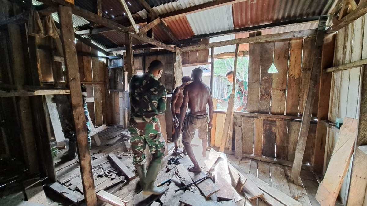 PAPUA – Meningkatkan Kemanunggalan TNI dan rakyat, Satgas Pamtas RI-PNG Yonif 310/KK Pos Batom membantu proses pembangunan rumah Martina Oktemka (50) seorang janda yang hidup sendiri warga Kampung Okyako, Distrik Batom, Kabupaten Pegunungan Bintang, Papua, pada Sabtu (2/12/2023).