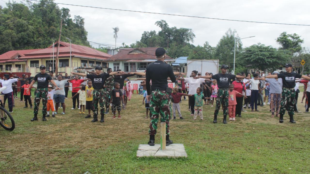 Maybrat, – Satgas Pamtas Kewilayahan Yonif 623/BWU ramaikan acara jalan santai yang di selenggarakan oleh pihak Gereja GKI Sion di Kampung Kumurkek, Distrik AIfat, Kabupaten Maybrat, Papua Barat Daya, hari ini, Sabtu (13/4/2024).