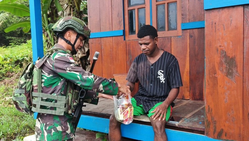 Teluk Bintuni, – Satgas Yonif 642/KPS Pos Dataran Beimes membagikan Makanan Ringan kepada masyarakat Kampung Horna, Distrik Dataran Beimes, Kabupaten Teluk Bintuni, Provinsi Papua Barat, pada Rabu (5/2/2025).