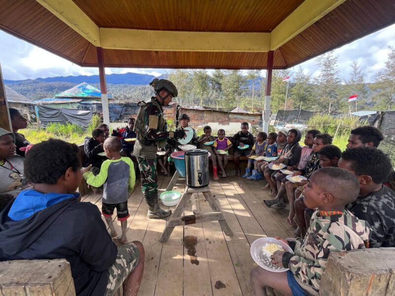 Kegiatan penuh kehangatan ini dipimpin langsung oleh Danpos Eromaga, Letda Inf Sudirman, yang turun langsung berbaur dengan masyarakat. Dengan senyum bersahabat, para prajurit TNI tampak membantu membagikan makanan dan minuman hangat kepada warga yang berkumpul di sebuah pondok sederhana berlatar pegunungan hijau Papua.