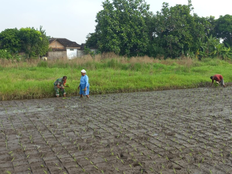 Boyolali, – Babinsa Koramil 09/Sawit Kodim 0724/Boyolali Serda Haryanto melaksanakan pemantauan wilayah serta melaksanakan pendampingan pekerjaan sawah yakni penanaman bibit padi di sawah milik seorang warga Desa Jatirejo, Kecamatan Sawit, Kabupaten Boyolali, pada Selasa ( 18/6/2024).