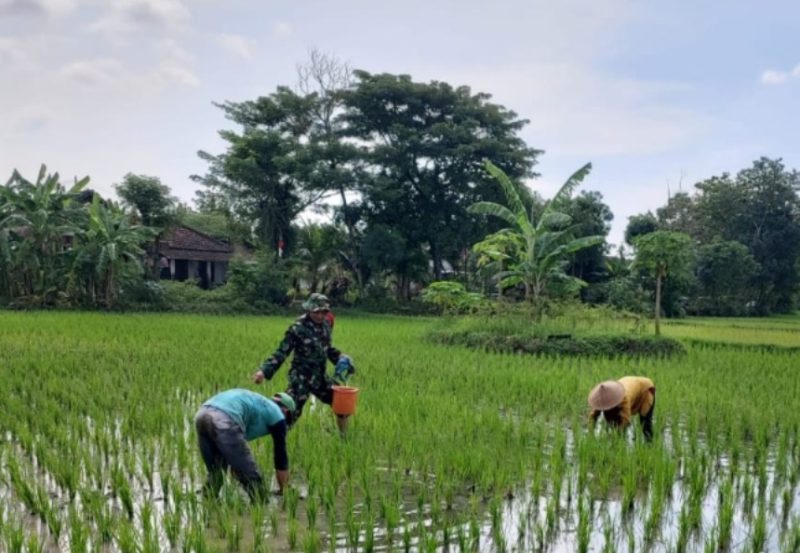 Tulungagung, – Mengenakan loreng kebanggaan, kaki berlumpur, dan tangan penuh pupuk, Serka Aris W tak tampak seperti prajurit biasa. Di Kelurahan Bago, Kecamatan Tulungagung, Babinsa dari Koramil Tipe B 0807/01 Tulungagung ini dikenal sebagai sosok yang aktif membantu para petani.