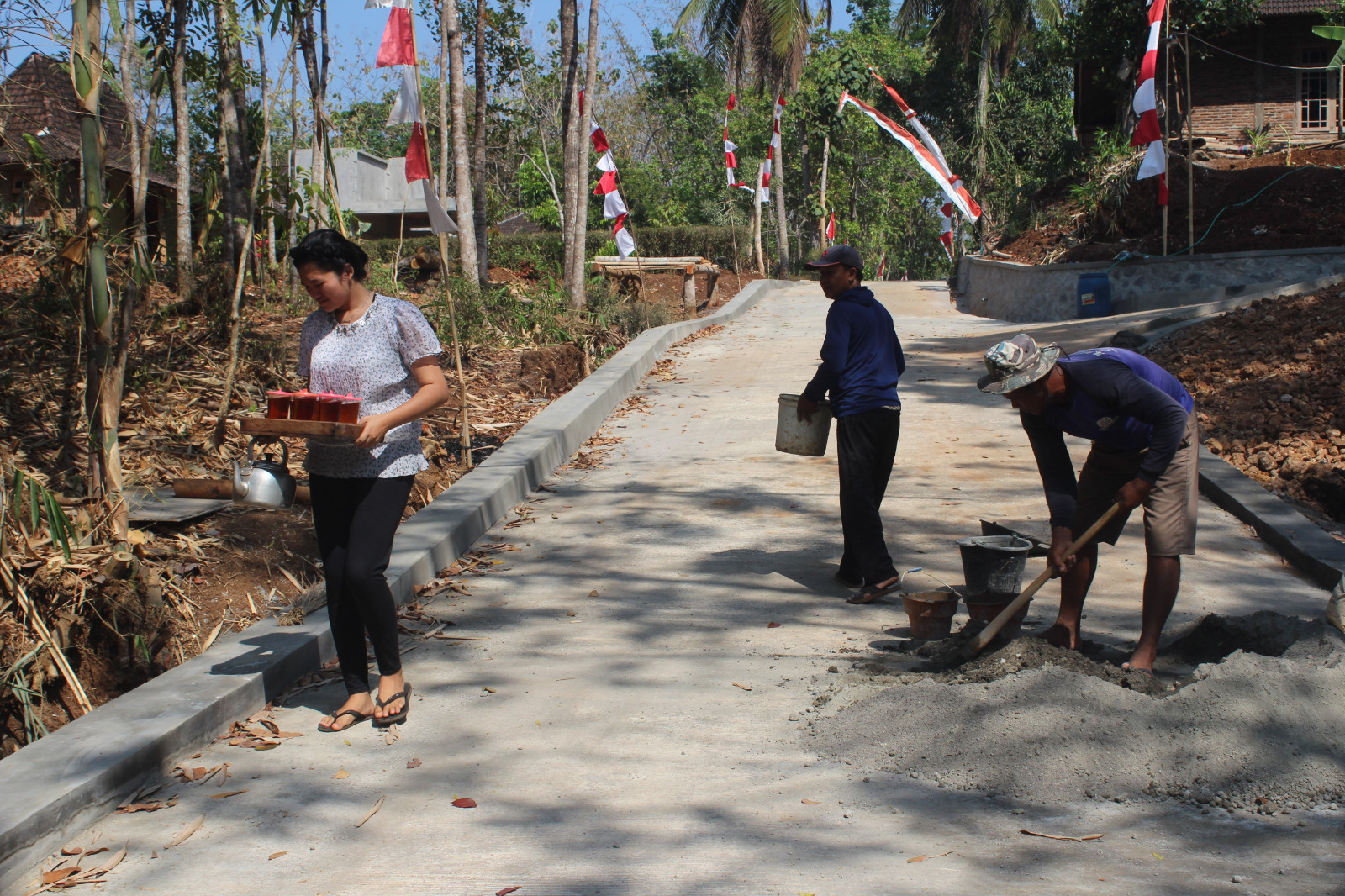 Fitri (38) dan Nur (37) warga RT 02/04, serta warga RT 05/04 Dusun Jegoh, yang mengantar makanan dan minuman untuk anggota satgas dan warga yang tengah berupaya merampungkan sasaran fisik berupa pembangunan rabat jalan beton sepanjang 251 m × lebar 3 m × tinggi 0.30 m.
