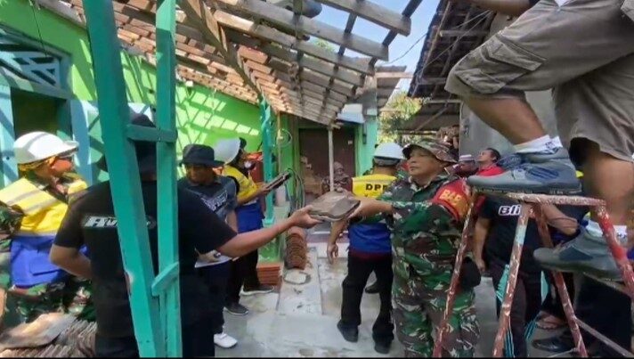 Babinsa Kelurahan Kepanjenkidul Koramil 0808/01 Sukorejo, Sertu Didik Subiantoro, bergotong royong bersama warga membongkar atap rumah milik Subagio, yang berlokasi di Jalan Srigading, RT 01 RW 02. Rumah tersebut tengah direnovasi karena kondisinya membutuhkan perbaikan.
