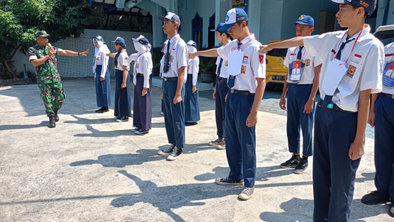 Babinsa Kelurahan Gilingan Koramil 02/Banjarsari Kodim 0735/Surakarta Serka Fajar dan Serda Sandi memberikan pelatihan dasar Peraturan Baris Berbaris (PBB) kepada Siswa-siswi Pramuka SMAN 2 di Jl. Monginsidi No 40 Kelurahan Gilingan Kecamatan Banjarsari, pada Minggu (4/8/2024).
