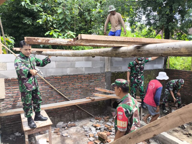 Sragen, – Tidak ada kamera, tidak ada panggung, tidak pula tepuk tangan. Hanya deru napas dan peluh yang membasahi seragam loreng di tengah terik matahari siang. Di sebuah sudut Dukuh Kalongbali Kidul, Desa Jetiskarangpung, Kecamatan Kalijambe, seorang prajurit TNI tampak khusyuk mencampur adukan semen. Ia bukan membangun markas. Ia membantu mendirikan dapur kecil milik seorang warga kurang mampu.