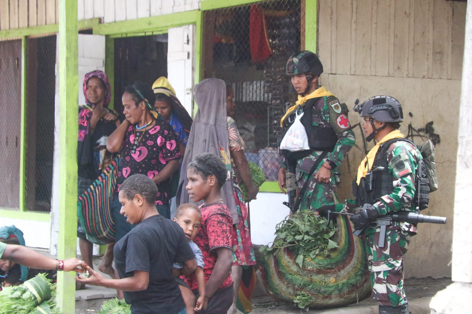 PAPUA – Satgas Pamtas Mobile Yonif Raider 300/BJW terus menggerakkan memborong bahan pangan di Pasar Distrik Sinak, Kabupaten Puncak, Provinsi Papua Tengah, guna terus meningkatkan perekonomian masyarakat yang ada di wilayah ini, Kamis (12/10/2023).
