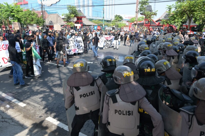 Tindakan provokatif peserta aksi melalui pembakaran beberapa ban bekas semakin membuat situasi semakin memanas, akhirnya Tim Kendaraan taktis melaksanakan penembakan water canon kepada peserta aksi massa agar terpecah dan segera membubarkan diri.