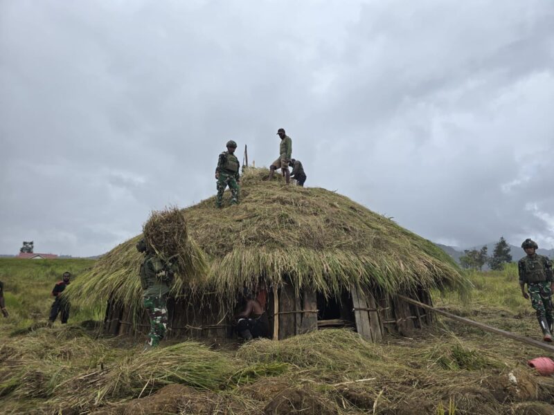 Di tengah lembah yang sunyi dan rerumputan basah, suasana haru dan hangat menyatu. Prajurit-prajurit muda bahu-membahu bersama warga. Mereka tidak hanya menenteng senjata, tapi juga memanggul alang-alang, menyusun jerami, mengikat batang kayu, menjahit ulang identitas budaya Papua dengan penuh hormat dan kasih.