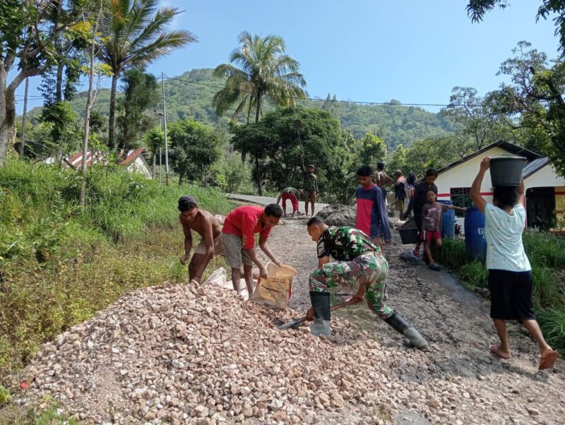 Di tengah terik matahari dan medan yang cukup menantang, para prajurit bersama warga bahu membahu menata batu, memadatkan tanah, dan memperbaiki jalur utama yang menjadi akses penting bagi aktivitas harian masyarakat.
