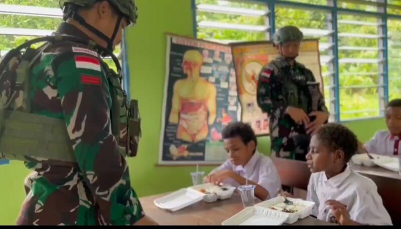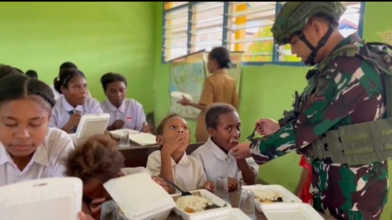 Teluk Wondama, – Suasana hangat terasa di SD dan SMP Naikere, Distrik Naikere, Kabupaten Teluk Wondama, Papua Barat, Kamis (12/6/2025) pagi. Di tengah keterbatasan akses dan medan yang tak mudah dijangkau, anak-anak sekolah di pelosok Papua itu menyantap makanan bergizi bersama para prajurit Satgas Yonif 642/Kps Pos Naikere.