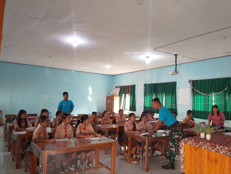 Dipimpin oleh Serda Akhlish, Komandan Regu Pos Oelbinose, para prajurit hadir untuk memberikan materi Wawasan Kebangsaan (Wasbang) dan pelatihan karakter kepada para siswa. Kegiatan digelar di Jalan Patimura, Kelurahan Aplasi, Kecamatan/Kota Kefamenanu, Kabupaten Timor Tengah Utara, Senin (21/7), dan melibatkan 20 siswa kelas IX A, terdiri dari 7 siswa laki-laki dan 13 siswi.