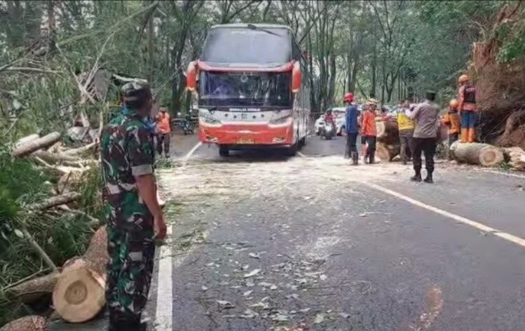 Trenggalek, – Cuaca ekstrem berupa hujan deras disertai angin kencang terus melanda Kabupaten Trenggalek, menyebabkan pohon sengon buto berukuran besar tumbang dan menutup total badan jalan di Jalur Nasional Trenggalek-Ponorogo, Kecamatan Tugu, pada Rabu (2/4/2025). Akibatnya, akses vital yang menghubungkan antar kabupaten ini lumpuh total, menghambat mobilitas masyarakat dan berpotensi membahayakan pengguna jalan.