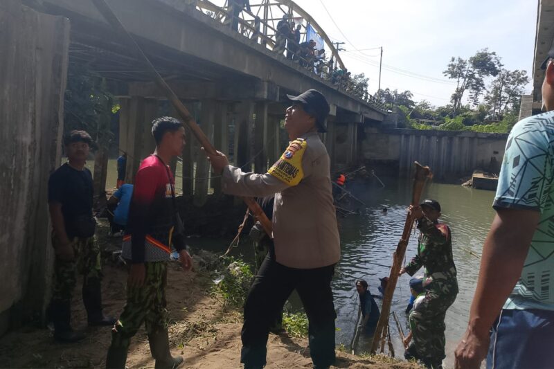 Di bawah terik matahari, aparat dan warga bahu-membahu menarik carang bambu ori yang menyangkut di pondasi jembatan. Selain bambu, sampah rumah tangga juga dibersihkan agar aliran Sungai Ngasinan tetap lancar.
